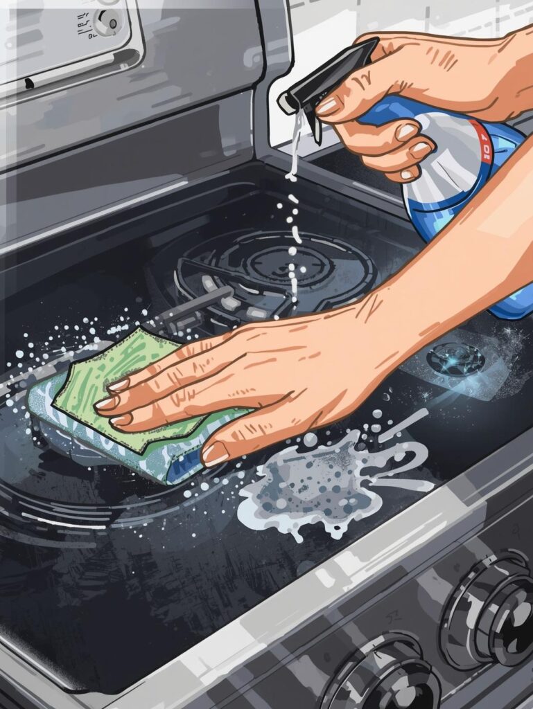 2. Spray the stove surface with a mixture of vinegar and water (1:1 ratio).
